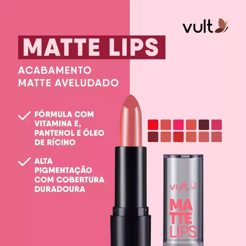 Batom Vult Matte Lips com acabamento matte aveludado. Sua textura confortável tem alta pigmentação e alta cobertura duradoura.