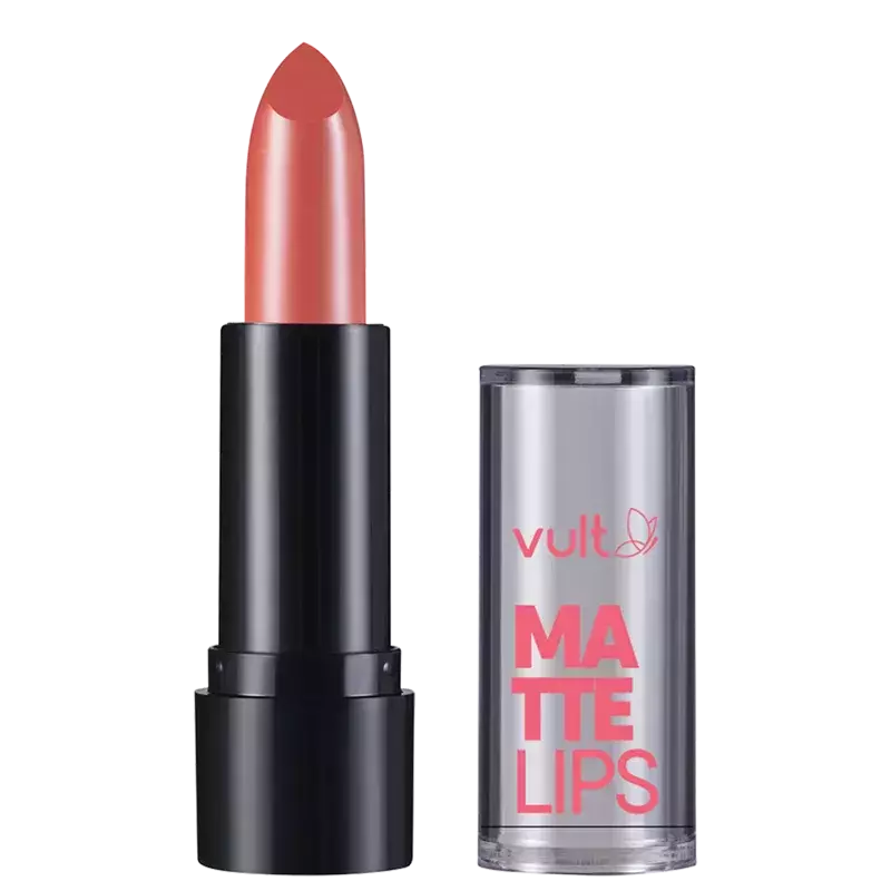 Batom Vult Matte Lips com acabamento matte aveludado. Sua textura confortável tem alta pigmentação e alta cobertura duradoura.