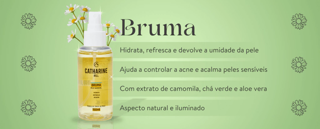 A Bruma Hidratante Catharine Hill proporciona hidratação instantânea, fixação prolongada da maquiagem e sensação de frescor. Ideal para todos os tipos de pele, garante acabamento radiante e duradouro no seu dia a dia.