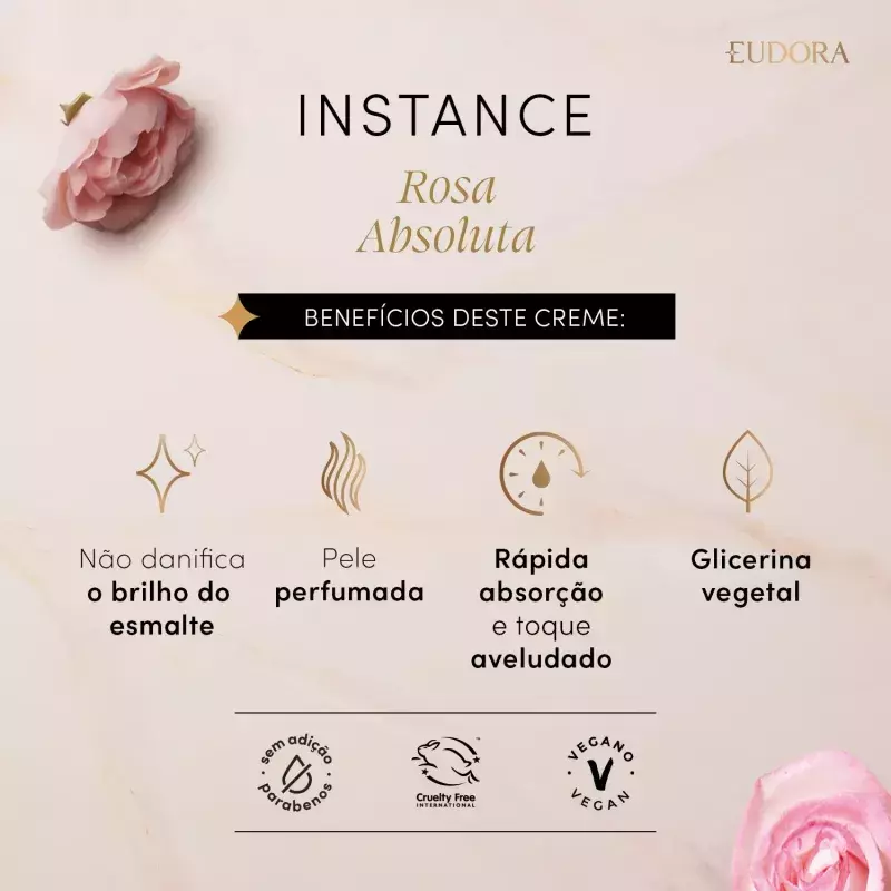 Eudora Instance Creme Perfumado para Mãos Rosa Absoluta possui textura em creme e secagem rápida para deixar sua pele macia e perfumada