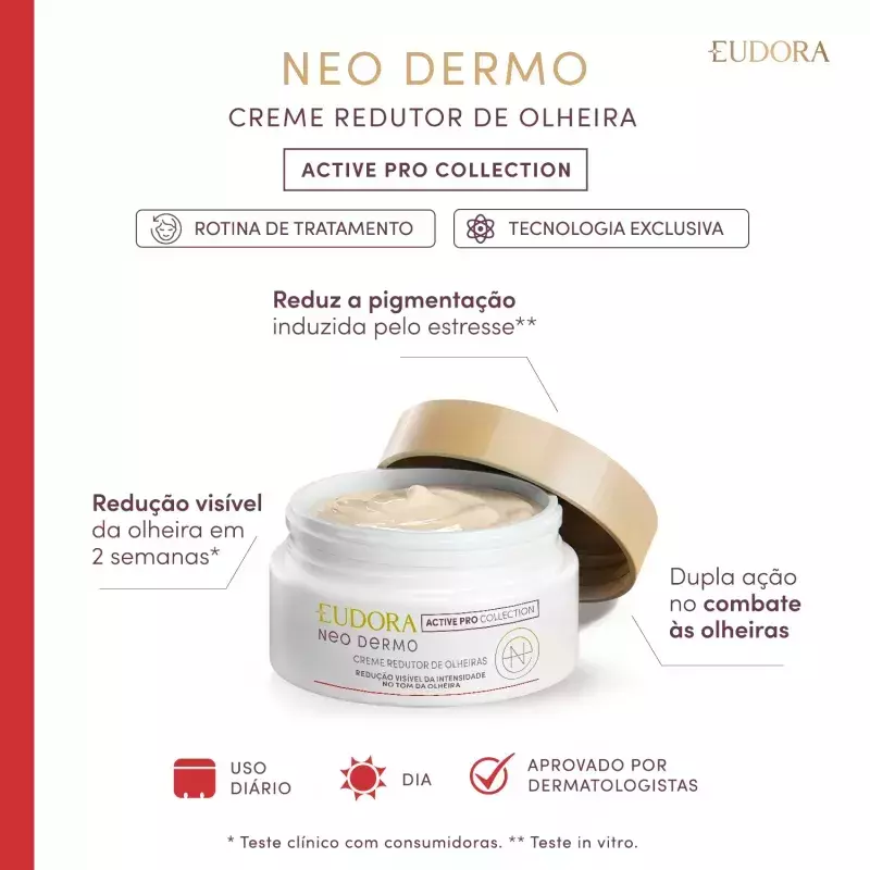 Sua textura leve e de rápida absorção nutre e hidrata a pele delicada ao redor dos olhos, sem pesar. O Creme Redutor de Olheiras Neo Dermo é testado e aprovado por dermatologistas e garante resultados visíveis.