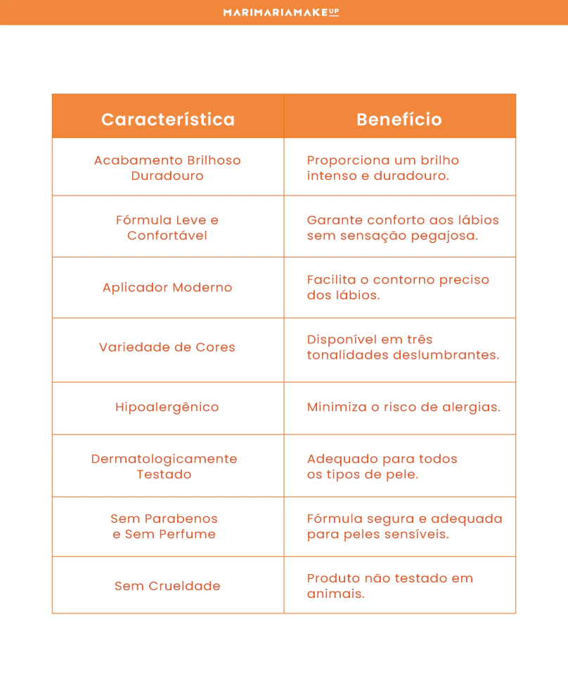 Sua fórmula hipoalergênica é leve e proporciona um acabamento brilhoso duradouro, sem tirar o conforto dos lábios.