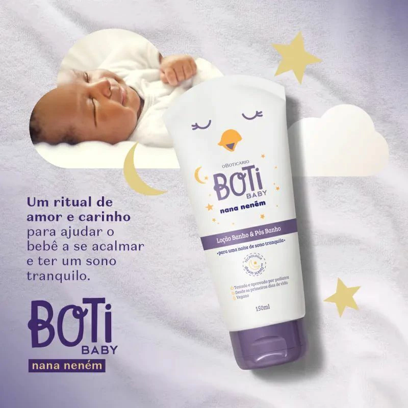 A Loção Hidratante Corporal Boti Baby Nana Neném entrega uma fragrância delicada em uma textura suave para envolver seu bebê em uma noite de sono tranquila com ingredientes naturais e vários benefícios: