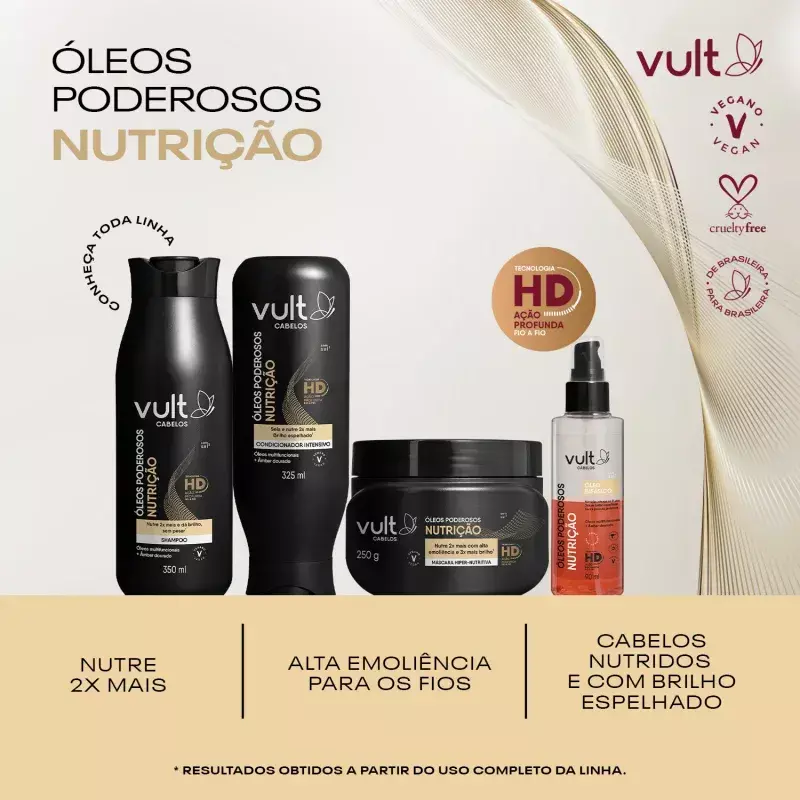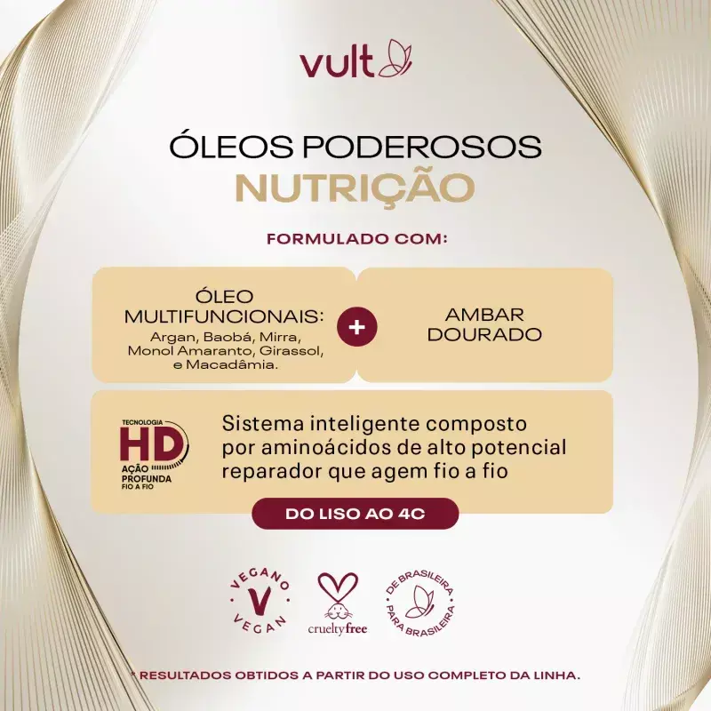 Com nova fórmula desenvolvida com Tecnologia HD, que é um sistema inteligente composto por aminoácidos reconhecidos pelo alto potencial reparador que agem profundamente fio a fio, a linha Vult Cabelos Óleos Poderosos Nutrição te deixa pronta e confiante para desbravar o mundo!