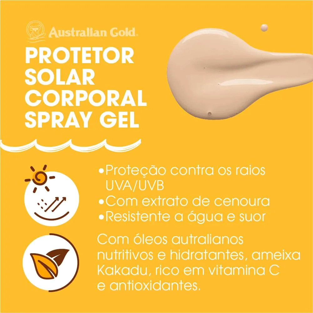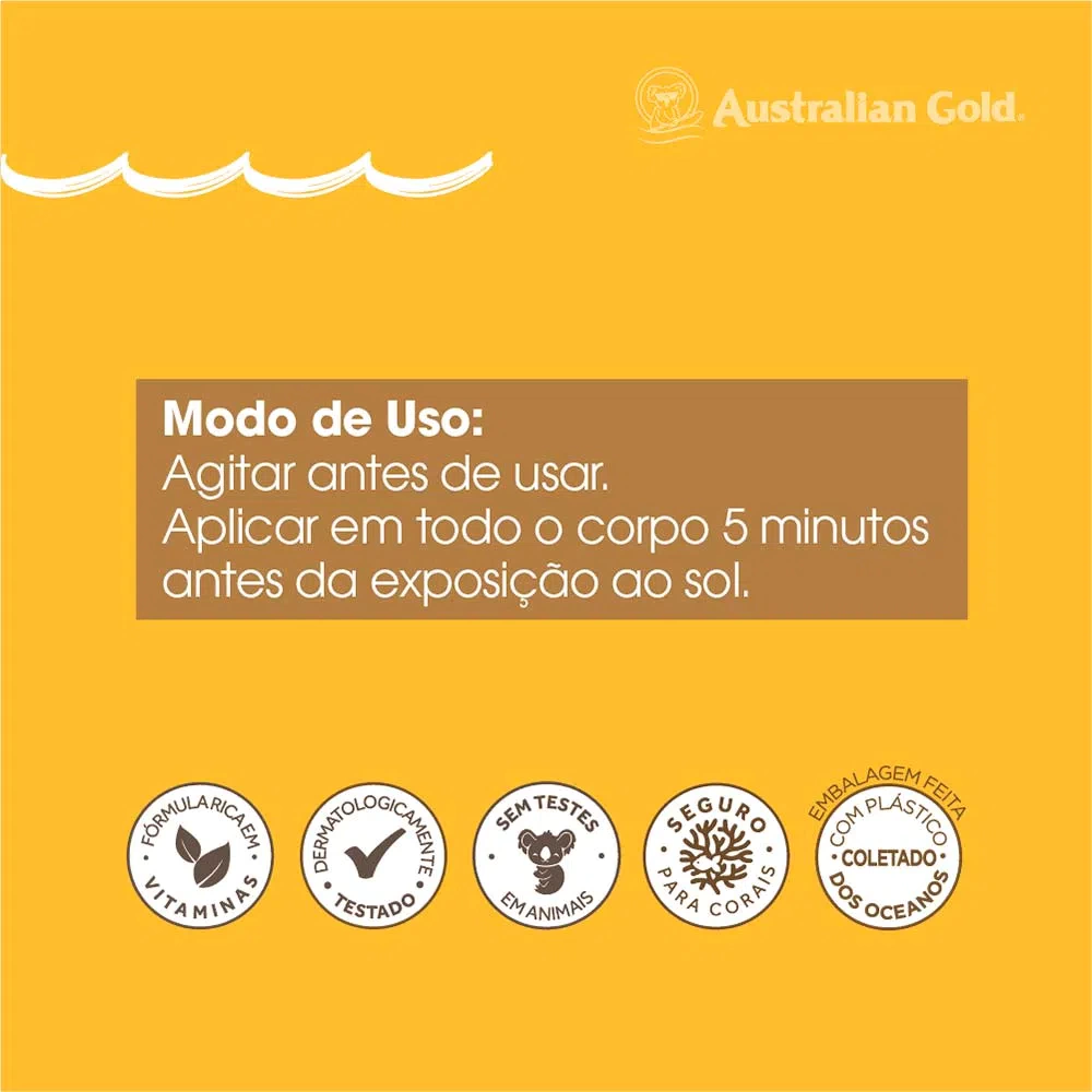 Protetor Solar Corporal FPS 15 da marca Australian Gold promove um bronzeado Instantâneo, que oferece uma suave coloração dourada à pele, e alta qualidade em proteção solar.