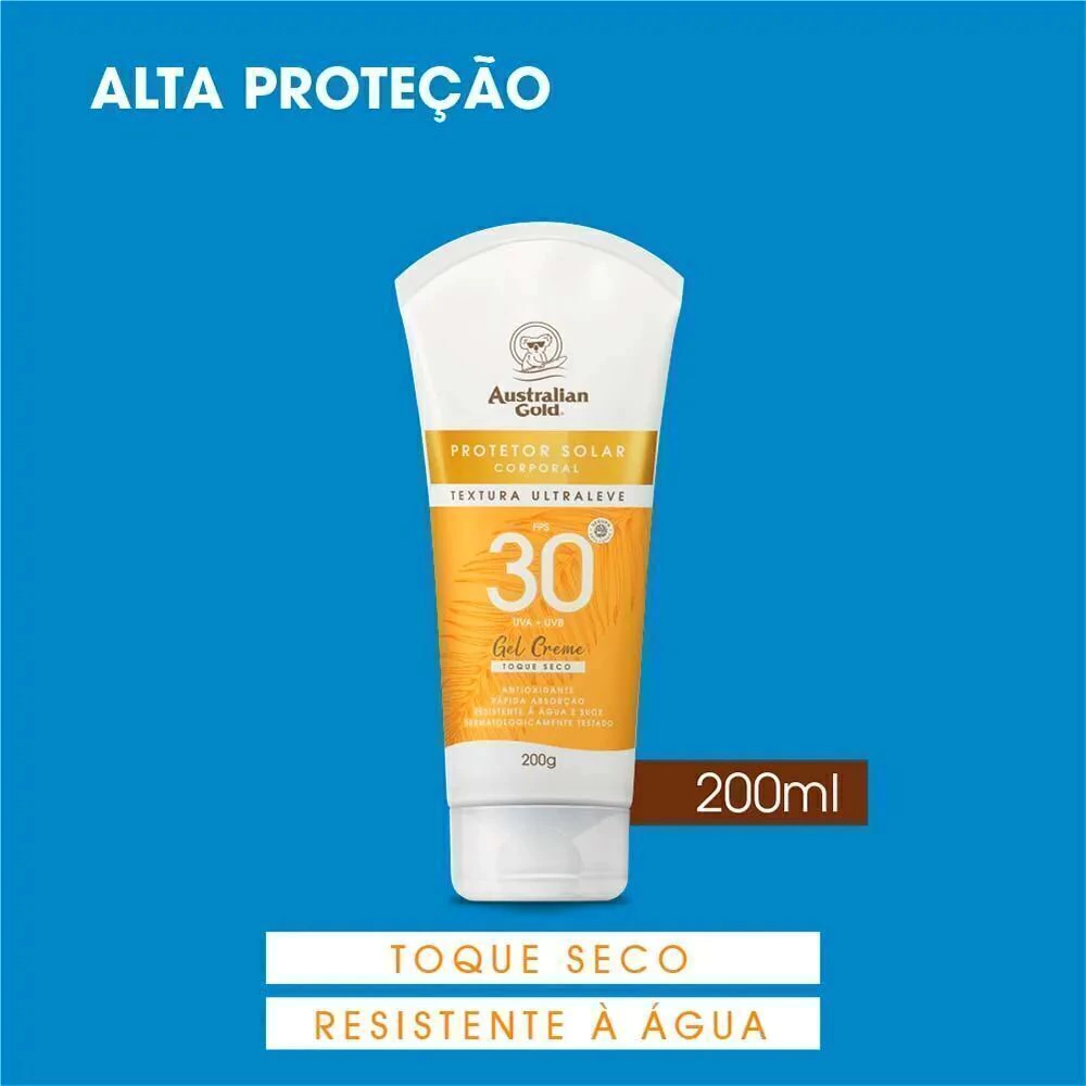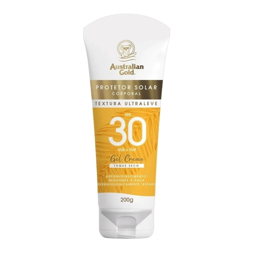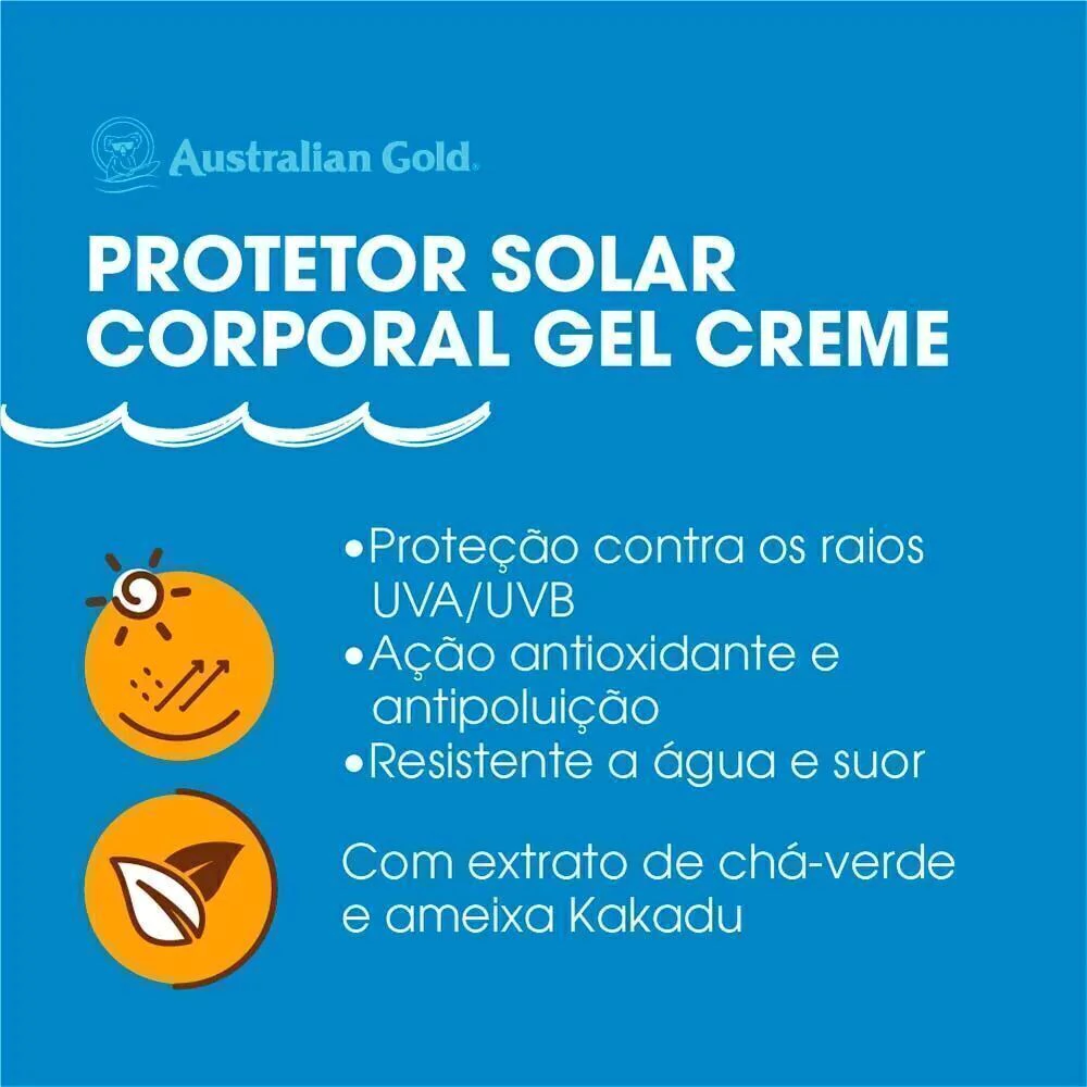 Protetor solar para todos os tipos de pele. Australian Gold Gel Creme FPS 30 promove ao corpo alta proteção contra o envelhecimento precoce e os raios nocivos do sol, UVB e UVA.
