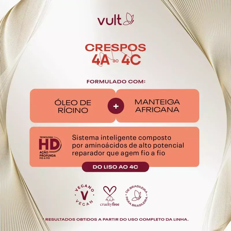O Shampoo Vult Cabelos Crespos 4A a 4C limpa sem ressecar os fios.Sua fórmula hidratante não embaraça, deixando os cabelos leves e com movimento.
