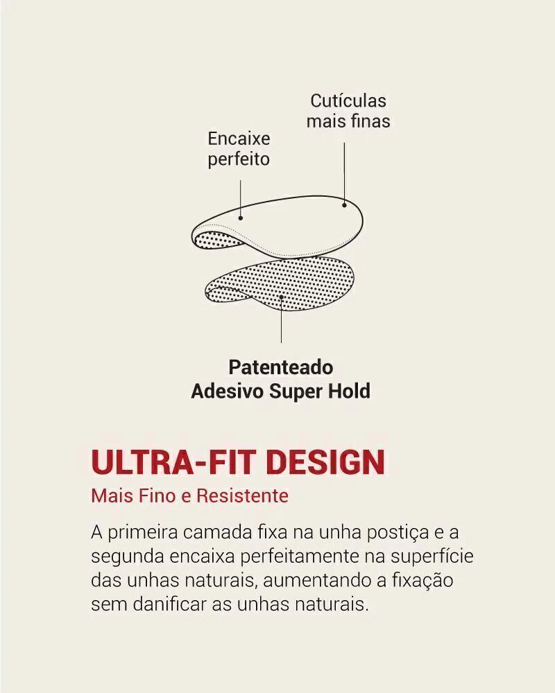 Com tecnologia Super Hold, a dupla camada de adesivo é a responsável por garantir unhas perfeitas por até 7 dias: enquanto a primeira camada do adesivo fixa na unha postiça, a segunda encaixa perfeitamente na superfície das unhas naturais sem danificá-las.