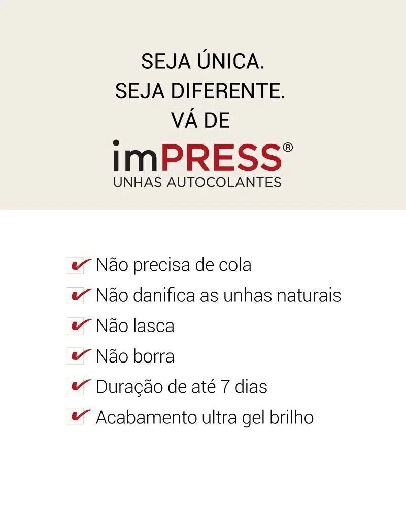 As imPRESS Unhas Autocolantes são a melhor opção para você que busca unhas perfeitas em instantes! Com tecnologia revolucionária Super Hold (patente pendente), a dupla camada de adesivo proporciona fixação prolongada, sem tempo de secagem e, o melhor, não danifica as suas unhas naturais. Também conta com o Ultra Gel Brilho, que garante um brilho superior ao esmalte e dura até 7 dias. Faça parte desta Revolução!